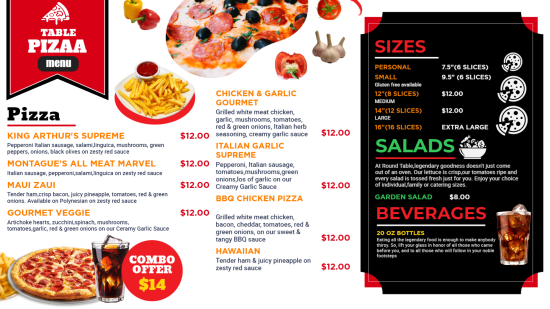 Create a digital menu board design that will boost your revenue. Be it Pepperoni pizza menu design to Margherita menu design, MenuRepo’s 100+ gallery has a collection for any category. These pizza menu design templates make designing menus easier for both amateurs and professionals alike. In addition, the templates are downloadable in any format, so you share the final design across multiple platforms.